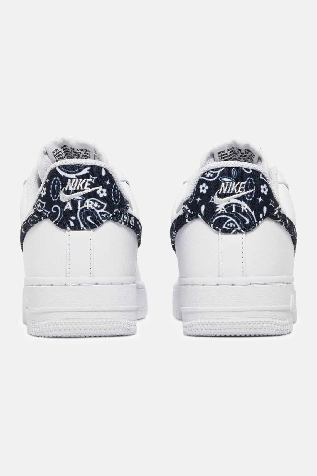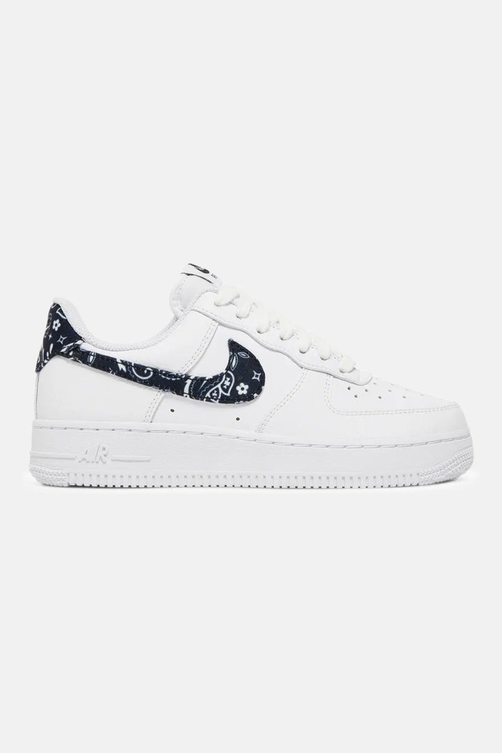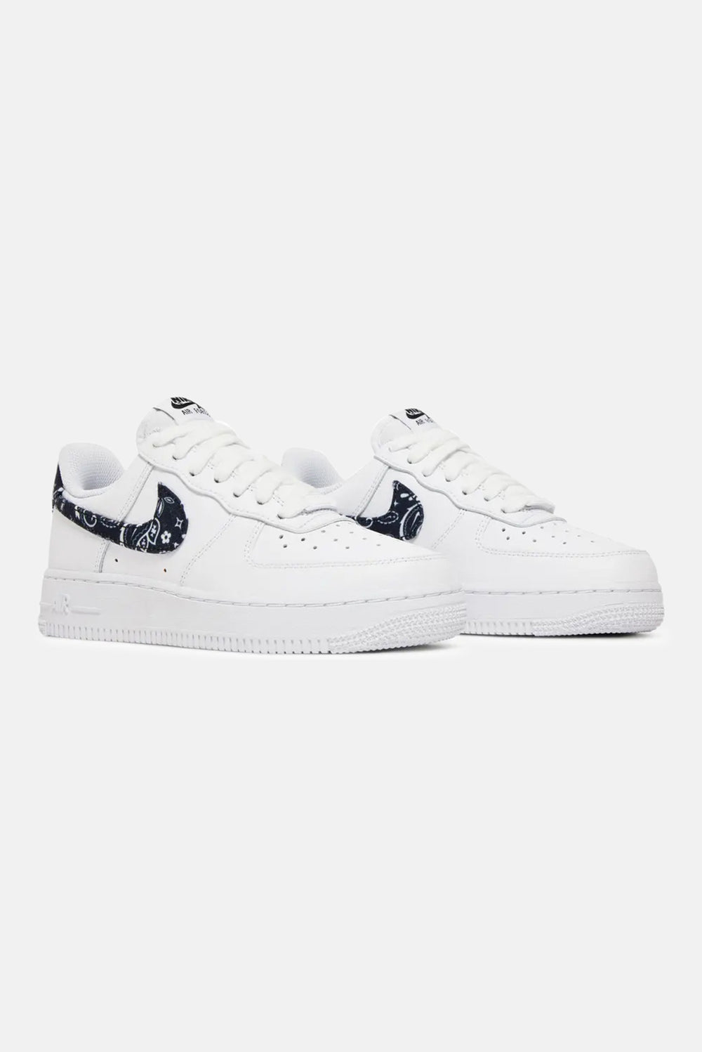 The Nike women’s Air Force 1 ‘07 Essentials ‘Black Paisley’ makes over the classic silhouette with refreshed branding. The low-top utilizes a white tumbled leather upper with textile detailing on the Swoosh and heel tab, both rendered in a black-and-white paisley print. Signature AF1 features remain intact, including a perforated toe box, breathable nylon tongue and variable-width lacing. The sneaker sits on a solid white rubber cupsole, complete with a pivot-point traction pattern on the outsole.