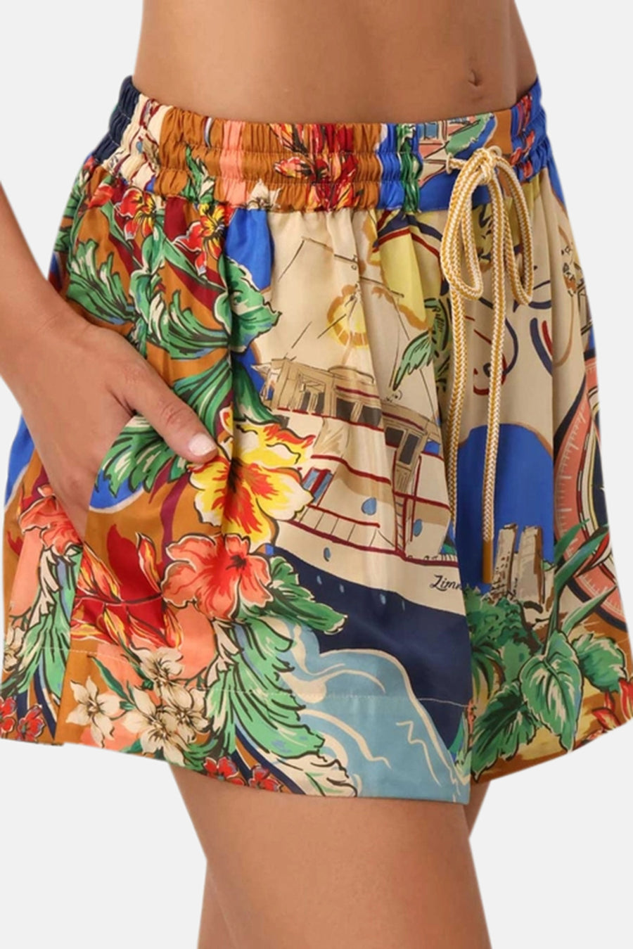 A silk high waisted short featuring a placement print and an elasticated waistband.