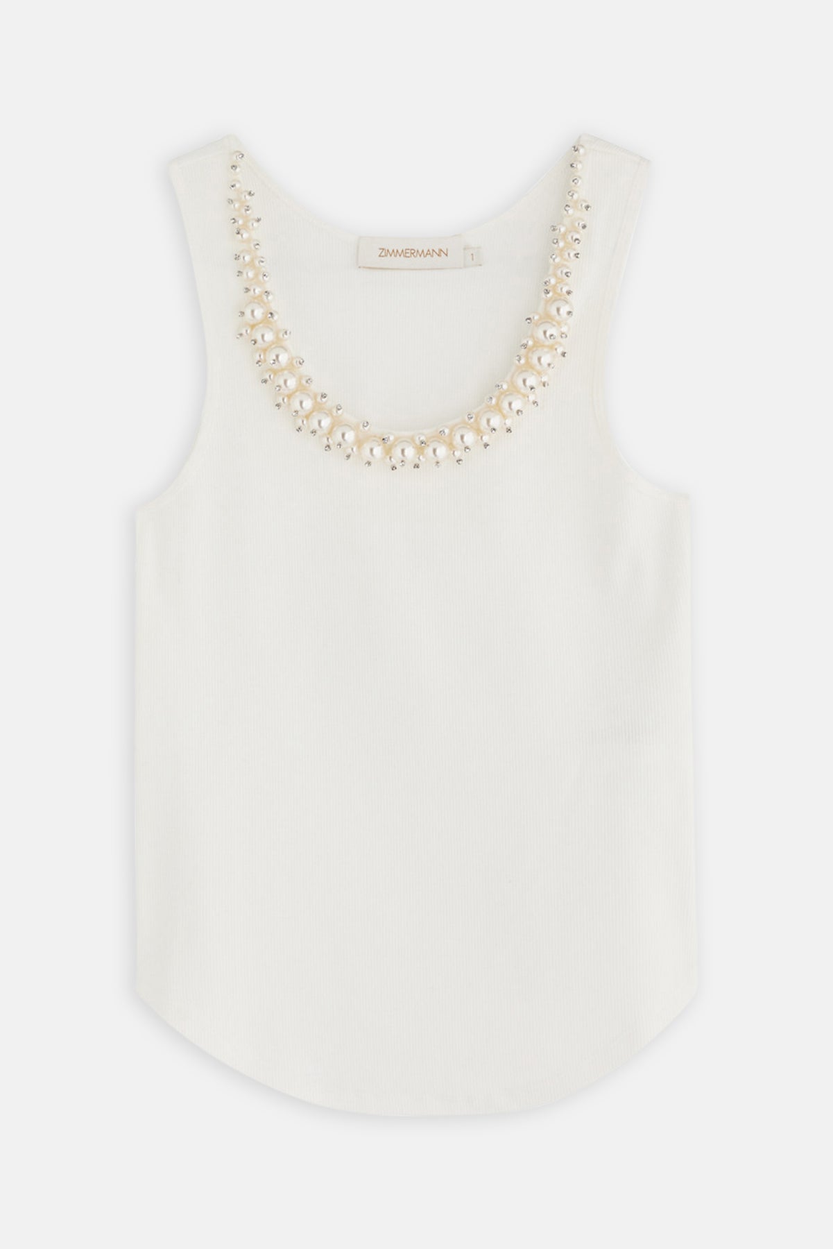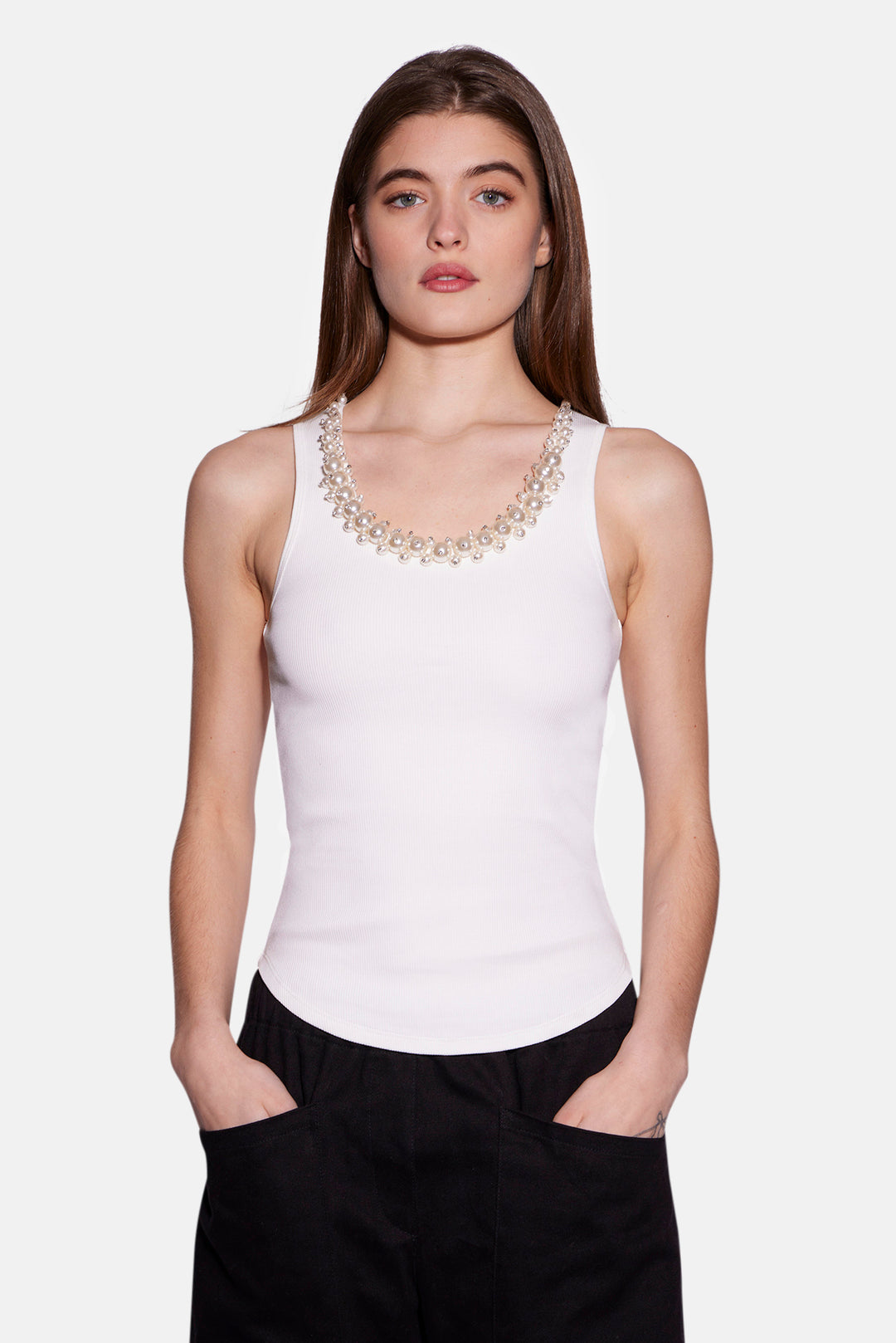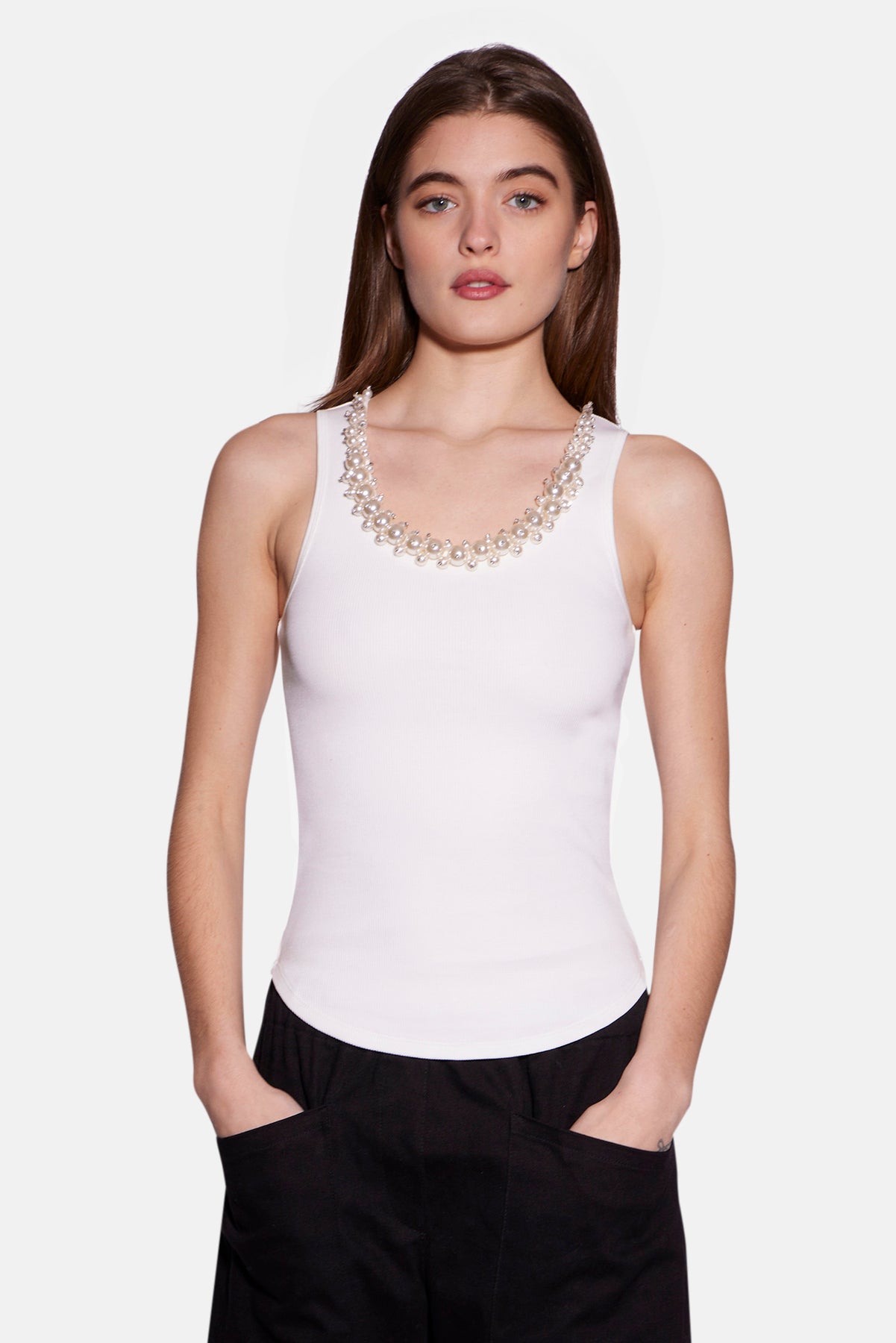 A stretch-cotton tank Ribbed, scoop-neck with faux pearl and crystal embellishments, curved hem Slips on