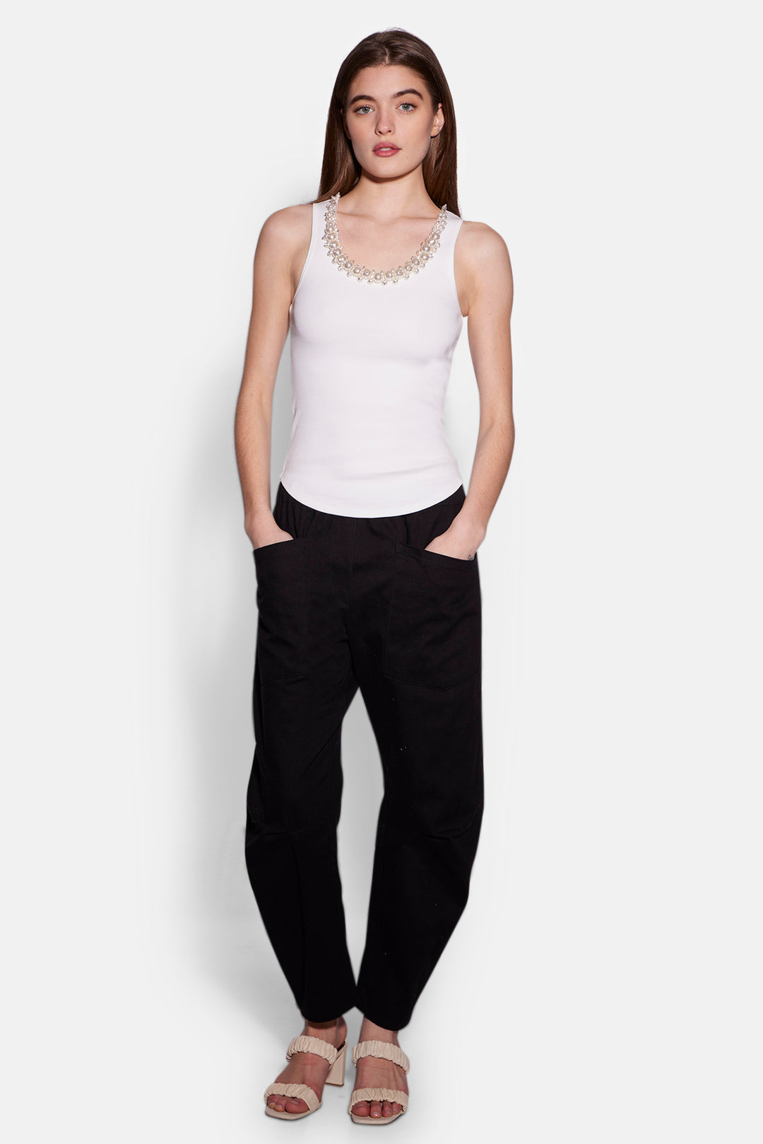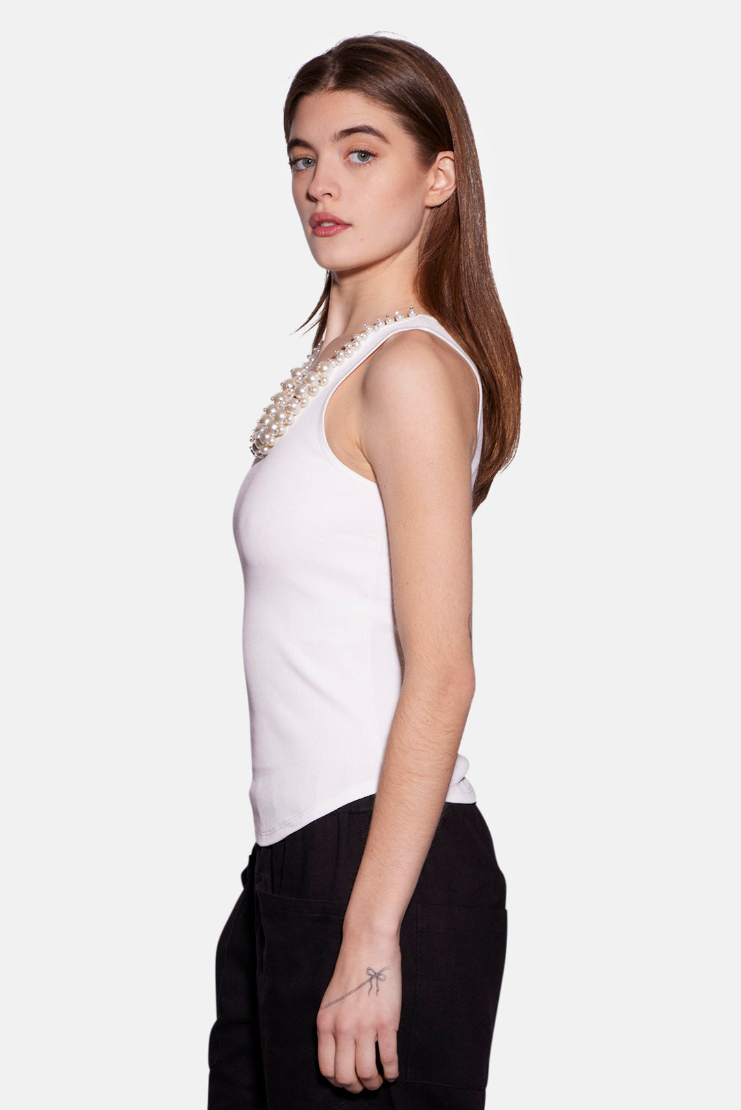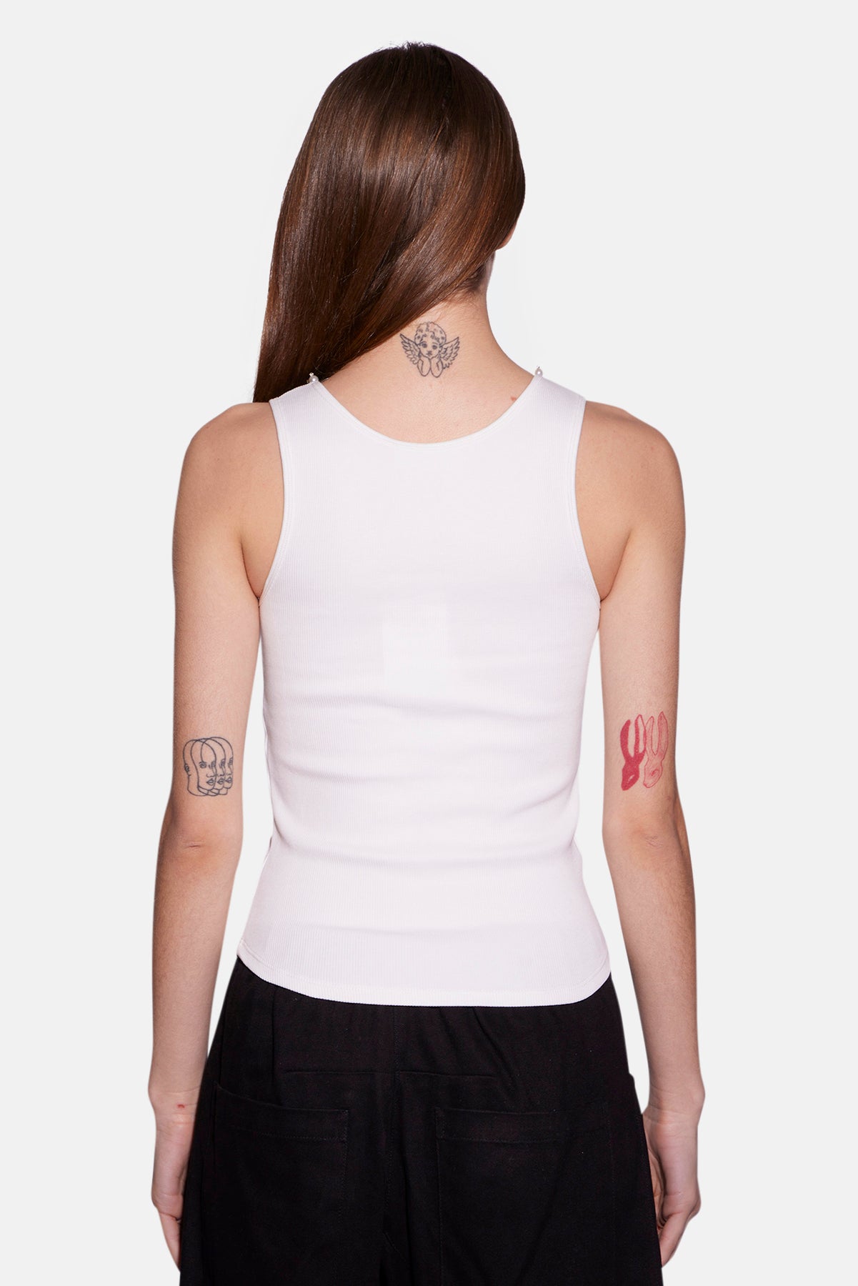 A stretch-cotton tank Ribbed, scoop-neck with faux pearl and crystal embellishments, curved hem Slips on