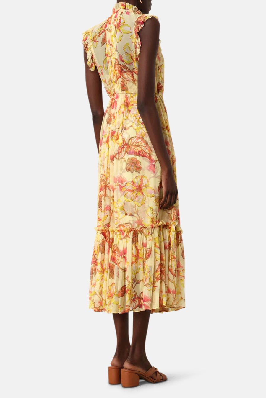 A crinkle georgette midi dress featuring a drop hem and 3D applique flowers along the collar.